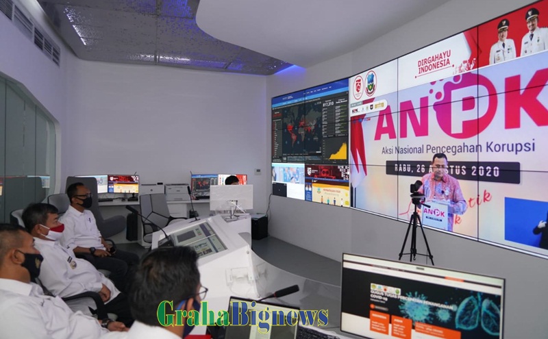Bupati Garut Rudy Gunawan, Rabu (26/8/2020), di Ruang Utama Gedung Garut Command Center, menghadiri video conference dengan KPK Republik Indonesia, melalui acara Aksi Nasional Pencegahan Korupsi. (Foto : Deni Septyan/Diskominfo Garut)