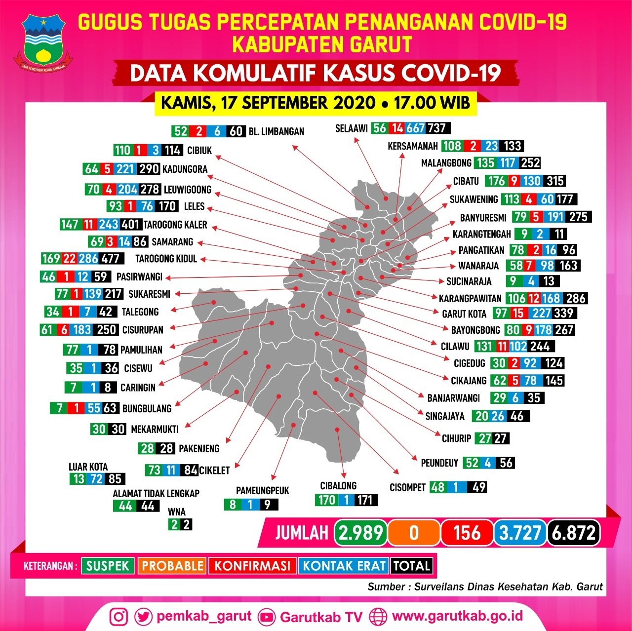 Garut – Yeni Yunita selaku Humas Gugus Tugas Covid-19 Kab. Garut, menyampaikan keterangan Pers-nya, bahwa perkembangan Kasus Covid-19 di Kabupaten Garut s.d Hari ini Kamis, 17 September 2020 Pukul 17.00 WIB. Berdasarkan data dari Sub Devisi pencegahan Gugus Tugas Percepatan Covid-19 Kabupaten Garut