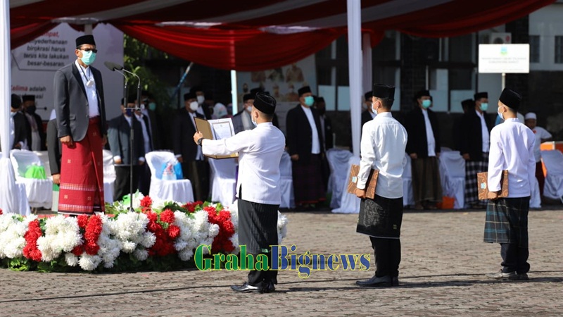 Mengenakan jas biru, kupiah dan sarung berwarna merah, Wakil Bupati Garut Helmi Budiman, memimpin upacara Hari Santri yang diselenggarakan secara nasional setiap tanggal 22 Oktober. Jumlah peserta upacara dibatasi, hanya perwakilan dari setiap pesantren di Garut, dengan menerapkan protokol Kesehatan.
