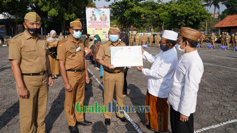 Bupati Garut, Rudy Gunawan, secara simbolis menyerahkan langsung bantuan sebesar 650 juta untuk renovasi Masjid Agung Garut kepada Ketua DKM Masjid Agung Garut, KH. K.H. A Mimar Hidayatullah, dalam kesempatan apel gabungan terbatas di Lapangan Setda Kabupaten Garut, Senin (9/11), disaksikan Wakil Bupati Garut, Helmi budiman, dan Plt. Sekretaris Daerah Kabupaten Garut, Zat Zat Munazat. (Foto : Deni Septyan/Diskominfo Garut-grahabignews.com)