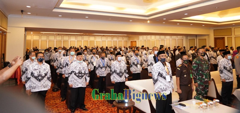 Bupati Garut, Rudy Gunawan, mengikuti kegiatan sekaligus membuka Konferensi PGRI Kabupaten Garut Masa Bakti XXII Periode 2020-2025, di Hotel Sumber Alam Cipanas, Kecamatan Tarogong Kaler, Kabupaten Garut, Rabu (2/12/2020). (Foto: Deni Septyan/Diskominfo-grahabignews.com)
