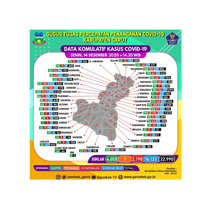Garut – Berdasarkan data dari Sub Devisi Pencegahan Gugus Percepatan Penanganan Covid-19 Kabupaten Garut. Disampaikan oleh Humas Gugus Tugas Percepatan Penanganan Covid-19 Kabupaten Garut, Perkembangan Kasus Covid-19 di Kabupaten Garut s.d Hari ini Senin, 14 Desember 2020 Pukul 14.30 WIB.