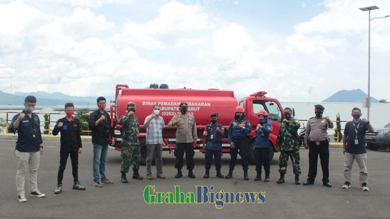Changshin Reksa Jaya, bekerja sama dengan Dinas Pemadam Kebarakaran (Disdamkar) Garut, melakukan penyemprotan disinfektan di area pabrik, Sabtu (19/12/2020). (Foto : Muhamad Azi Zulhakim-grahabignews.com)