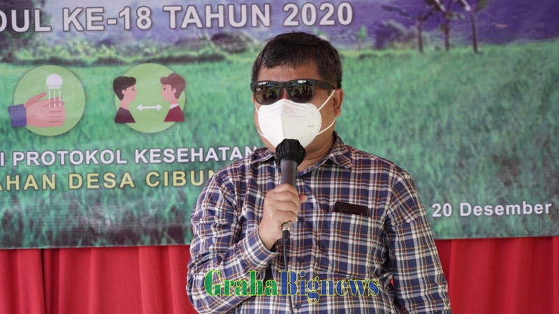 Bupati Garut, Rudy Gunawan, memberikan sambutan dalam acara Pencanangan Bumi Perkemahan Embung Desa Cibunar, dalam rangka memperingati HUT ke- 18, Kecamatan Taragong Kidul, Minggu (20/12/2020). (Foto : Deni Septyan/Diskominfo Garut-grahabgnews.com))