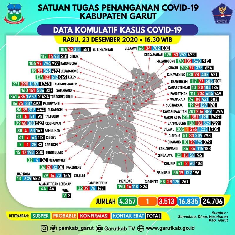 Garut – Perkembangan Kasus Covid-19 di Kabupaten Garut s.d Hari ini Rabu, 23 Desember 2020 Pukul 16.30 WIB. Dsampaikan oleh Humas Satuan Tugas Penanganan Covid-19 Kab. Garut.