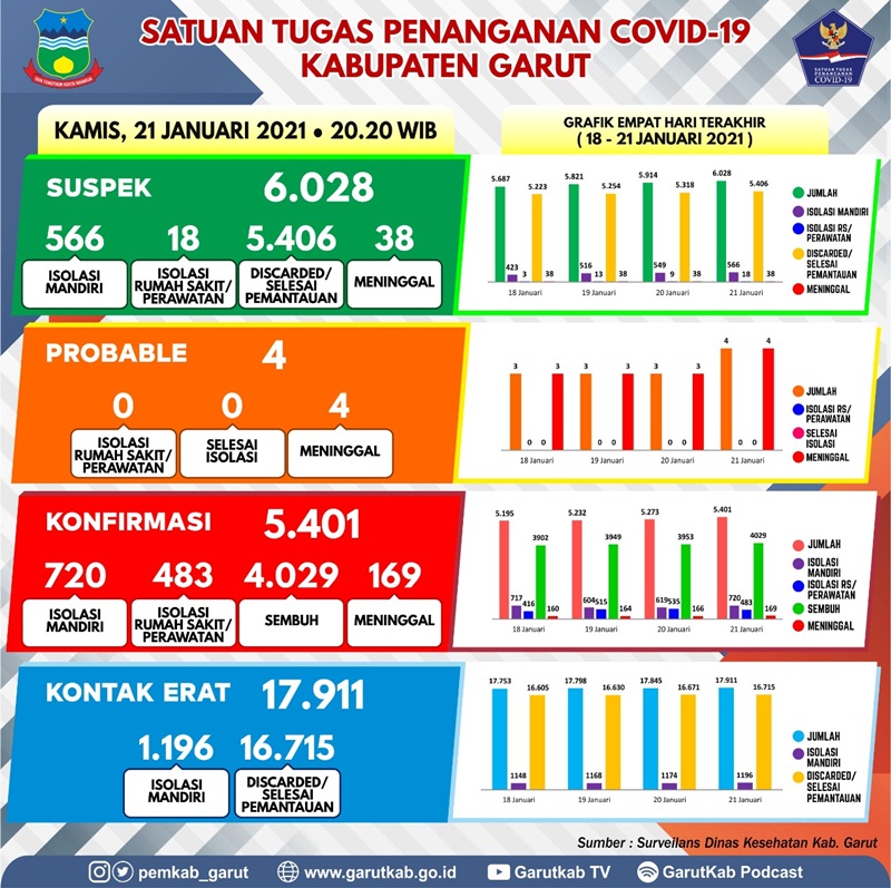 Garut – Perkembangan Kasus Covid-19 di Kabupaten Garut s.d Hari ini Kamis, 21 Januari 2021 Pukul 20.20 WIB. Disampakan oleh Humas Satuan Tugas Penanganan Covid-19 Kab. Garut, bahwa :
