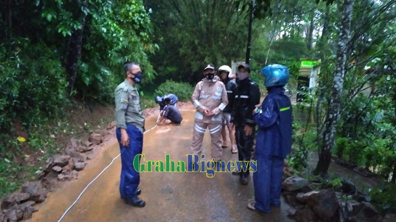Polsek Ganeas, Sat Pol PP dan warga masyarakat kemudian bahu membahu material yang menutupi badan jalan akibat pergeseran tanah.