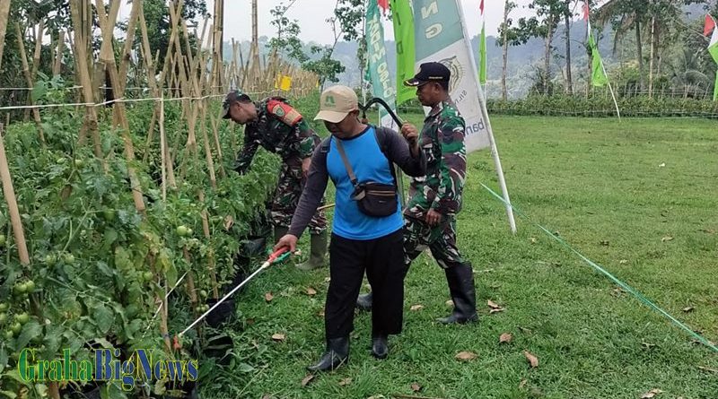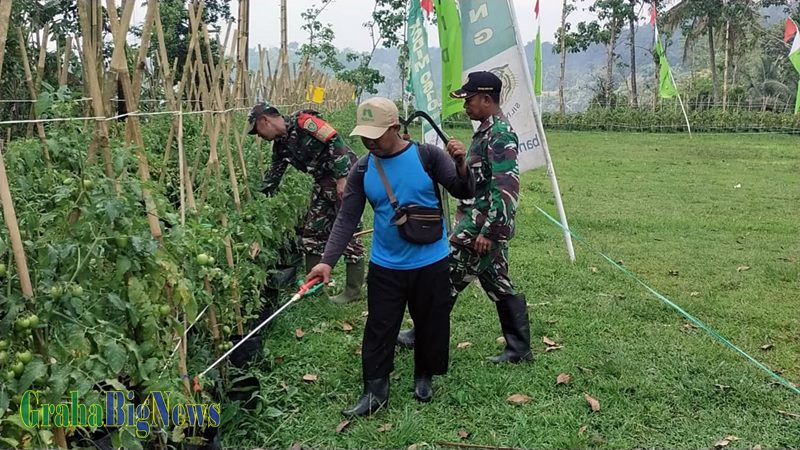 Sumedang –  Di tengah pandemi Covid-19, Satgas TMMD ke 110 Kodim 0610/Sumedang memanfaatkan lahan di sekitar Lapangan Desa Kertamukti, guna membudidayakan tanaman Tomat dan Terong melalui media polybag dengan memakai pupuk Bios 44, Sabtu (20/03/2021).