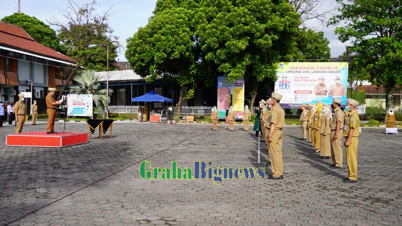 Bupati Garut, Rudy Gunawan, melantik 17 pejabat struktural di lingkungan pemerintahan Kabupaten Garut, di Apel Gabungan yang bertempat di Lapang Sekretariat Daerah (Setda) Garut, Kecamatan Tarogong Kidul, Kabupaten Garut, Senin (29/3/2021). (Foto : Deni Septyan/Diskominfo Garut-grahabignews.com)