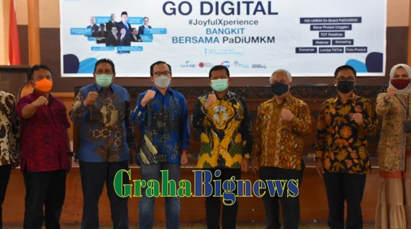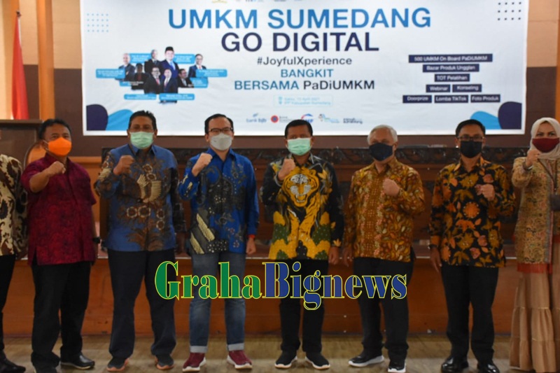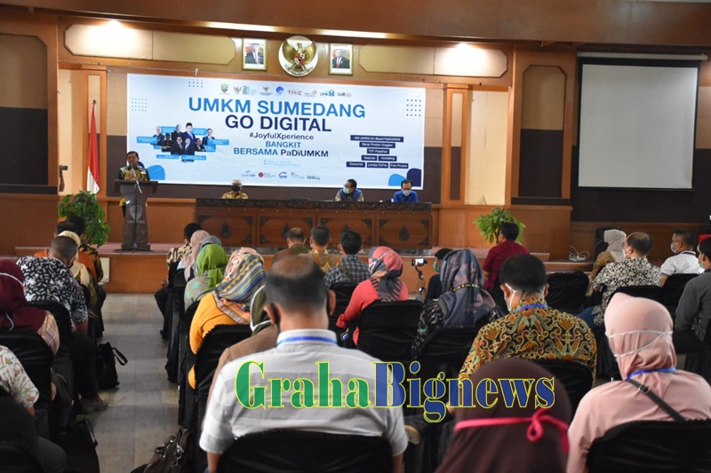 Guna mendorong pengembangan UMKM agar bisa naik kelas, Pemkab Sumedang bersama PT. Telkom Indonesia dan beberapa Kementerian menggelar acara UMKM Sumedang Go Digital di IPP Setda, Sabtu (10/4/2021).
