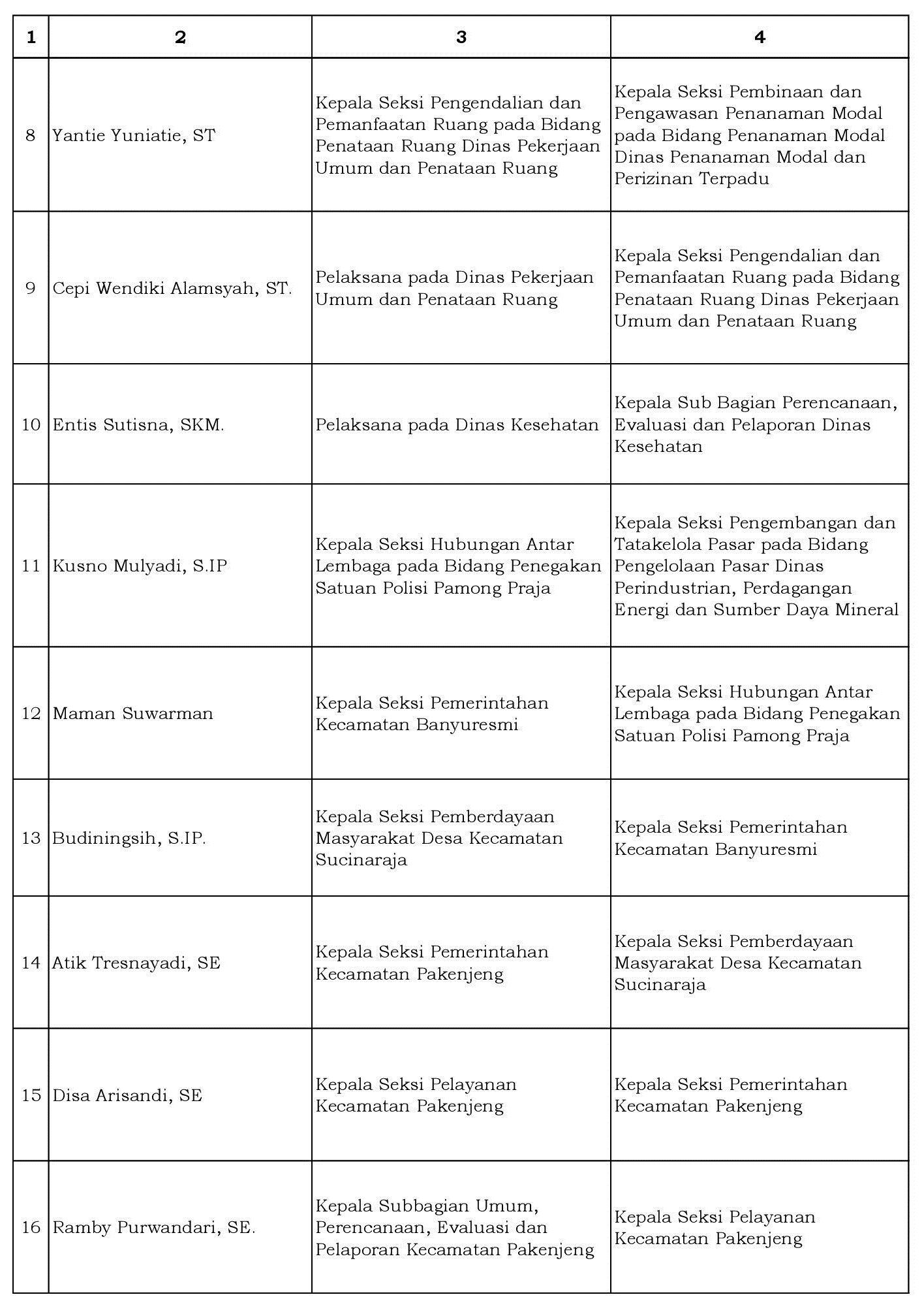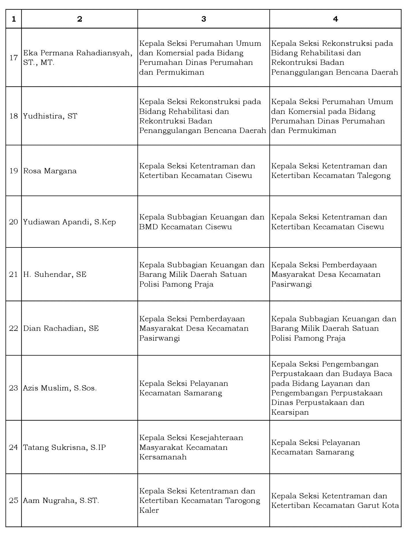 Pejabat yang dilantik sebanyak 7 orang diantaranya adalah jabatan administrator, yaitu 1 orag camat, 1 orang kepala bidang, 2 orang kepala bagian, dan 3 orang sekretris dinas. Sementara sisanya dilantik untuk jabatan pengawas.