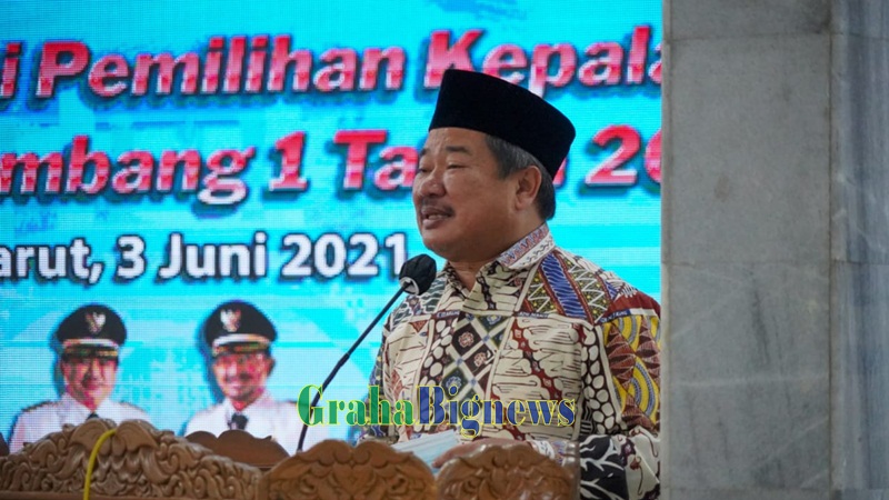 Bupati Garut, Rudy Gunawan beserta Unsur Forkopimda, tokoh ulama dan masyarakat dan perwakilan calon kades dalam Pelaksanaan Deklarasi Pilkades Damai dan Do'a Bersama, di Gedung Pendopo Garut, Kamis (3/6/2021) (Foto : Dok. Diskominfo Garut-grahabignews.com)