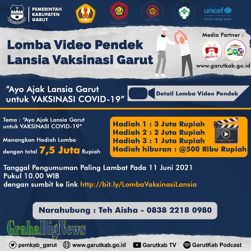 Lomba video ini mengusung tema “Ayo Ajak Lansia Garut untuk Vaksinasi Covid-19”, dengan memperebutkan hadiah total 7.5 juta rupiah dan pendaftaran secara gratis. Sedangkan untuk pengiriman karya video, panitia memberi deadline paling lambat tanggal 11 Juni 2021, pukul 10.00 WIB. Untuk informasi lebih lanjut bisa dilihat di Instagram @pemkab_garut atau menghubungi narahubung Aisha (083822180980).