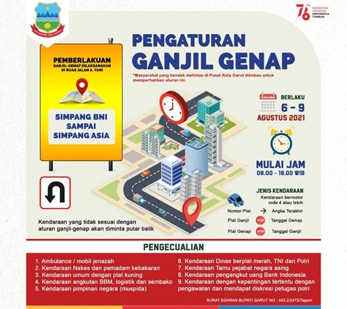 Tertulis dalam SE Bupati Garut, setiap warga yang memakai kendaraan melewati ruas Jl. Ahmad Yani (mulai simpang BNI – simpang Asia) dikenakan pemberlakuan lalu lintas ganjil genap dari mulai tanggal 6 Agustus – 9 Agustus 2021. Pemberlakuan ganjil genap tersebut hanya dilakukan pada pukul 08.00 – 18.00.