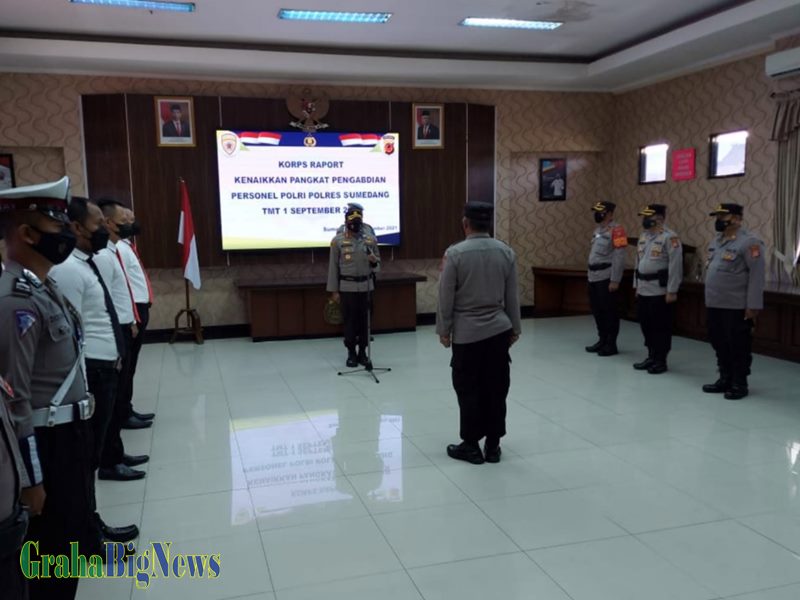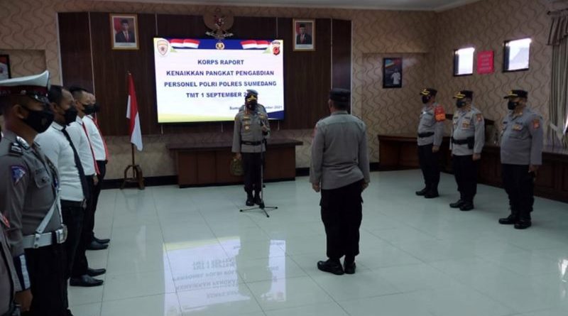 Sumedang – Kapolres Sumedang AKBP Eko Prasetyo, Pimpin Korp Raport Kenaikan Pangkat Pengabdian kepada 2 anggota yang berprestasi dalam melaksanakan tugasnya, bertempat di Aula Tribrata Polres Sumedang, Rabu (01/09/2021).