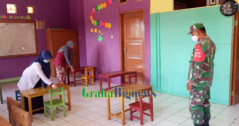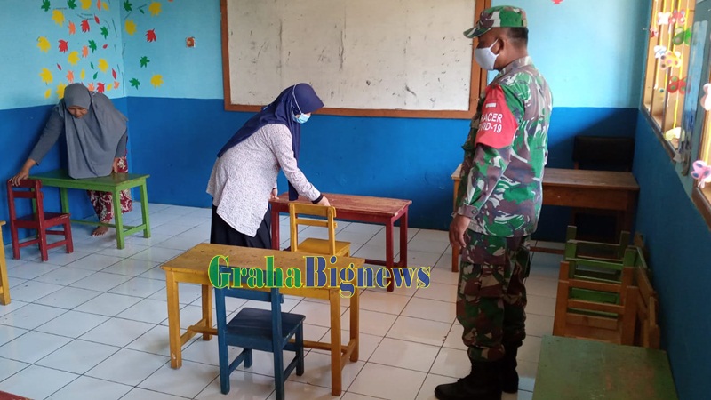 Dalam kesempatan tersebut, selain memantau jumlah siswa sesuai pengaturan jaga jarak disetiap ruangan kelas, Serka Isep juga mengecek persiapan kelengkapan tempat cuci tangan, dan penggunaan masker.