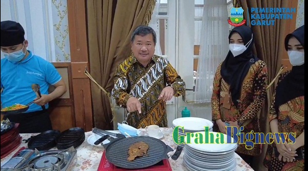 “Kami akan menyuguhkan sesuatu yang luar biasa yaitu steak domba Garut, ini steak domba Garut sengaja kami bawa ke Pendopo dimasak di sini supaya hangat, (dan) ini adalah makanan khas orang Garut yang diminati sejak zaman dahulu oleh Charlie Chaplin, oleh tamu-tamu dari luar negeri sebelum kemerdekaan, steak donba Garut luar biasa,” ujar Bupati Garut, sebelum menerima kunjungan kerja Ketua Umum PAN, Zulkifli Hasan, beserta Ketua DPW PAN Jawa Barat, Desy Ratnasari dan rombongan, di Ruang Pamengkang, Kecamatan Garut Kota, Kabupaten Garut, Selasa (14/9/2021).
