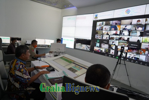 Bupati Garut, Rudy Gunawan, memberikan arahan dalam melakukan Rapat Koordinasi (Rakor) dengan Camat se-Kabupaten Garut, terkait dengan peringatan dari Badan Meteorologi, Klimatologi, dan Geofisika (BMKG) terkait peringatan Laninan di Kabupaten Garut yang dilaksanakan secara virtual, di Gedung Command Center, Kecamatan Garut Kota, Kabupaten Garut, Kamis (16/9/2021). (Deni Seftyan/Diskominfo Garut-grahabignews.com)