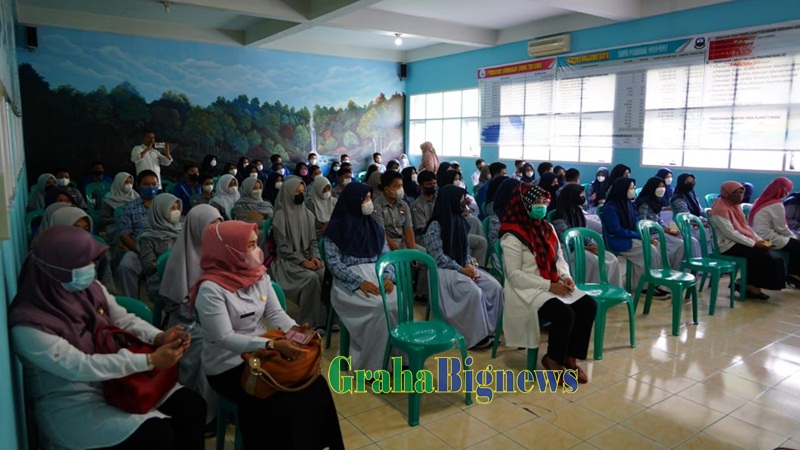 Kegiatan Sosialisasi Konsumsi Pangan B2SA Berbasis Dengan Lokal Dalam Rangka Diversifikasi dan Ketahanan Pangan Masyarakat dengan memberikan 500 kudapan bergizi untuk anak-anak sekolah di SMPN 1 Garut, Jalan Ahmad Yani, Kecamatan Garut Kota, Kabupaten Garut, Rabu (13/10/2021).(Foto: Tim Diskominfo Garut-grahabignews.com)