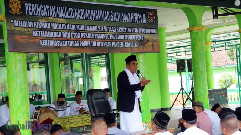 Tema acara adalah Melalui Hikmat Maulid Nabi Muhammad SAW 1443 H/2021 M, Kita Tingkatkan Keteladanan Dan Etos Kerka Personil TNI Guna Mendukung Keberhasilan Tugas Pokok TNI Di Tengah Pandemic Covid-19.