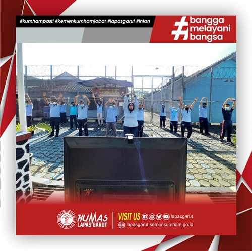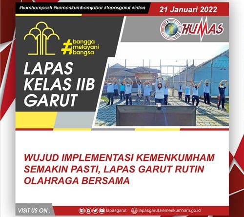 Garut – Jum’at (21/01/2022) Dalam rangka menjaga kesehatan dengan semangat PASTI lebih baik, Pegawai Lapas Garut untuk kesekian kalinya mengikuti giat olah raga bersama dengan tema “KUMHAM SEHAT, KUMHAM PRODUKTIF” berupa senam pernapasan/jantung dan Aerobik yang dilanjutkan dengan penyuluhan kesehatan dilaksanakan secara virtual, bertempat di lapangan apel gedung I Lapas Garut.