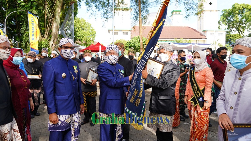 Bupati Garut, Rudy Gunawan, menyerahkan piagam penghargaan Purwa Intan Kedaton Tahun 2022 kepada Camat Selaawi, Ridwan Effendi, pada pelaksanaan Upacara Peringatan HJG ke - 209 yang dilaksanakan di Alun-Alun Garut, Kecamatan Garut Kota, Kabupaten Garut, Rabu (16/2/2022). (Foto : Tim Diskominfo Garut-grahabignews.com).