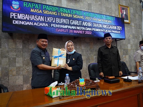 Garut – Bupati Garut, Rudy Gunawan, menghadiri Rapat Paripurna Dewan Perwakilan Rakyat Daerah (DPRD) Kabupaten Garut Masa Sidang I Tahun Sidang 2022 Dalam Rangka Pembahasan Laporan Keterangan Pertanggungjawaban (LKPJ) Bupati Garut Akhir Tahun Anggaran 2022, dengan agenda Penyampaian Nota Pengantar dan Pembentukan Panitia Khusus (Pansus), berpangsung secara hybrid, di Ruang Rapat Paripurna DPRD Garut, Jalan Patriot, Kecamatan Tarogong Kidul, Kabupaten Garut, Senin (28/3/2022).