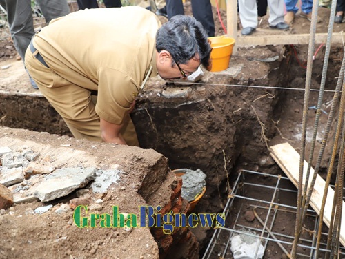 Wabup Garut, dr. Helmi Budiman, melaksanakan peletakan batu pertama pembangunan Madrasah Al-Jihad, yang berlokasi di Kampung Lembupanjang, Desa Cimaragas, Kecamatan Pangatikan, Kabupaten Garut, Senin (30/5/2022). (Foto : Yogi Budiman/Diskominfo Garut-grahabignews.com).