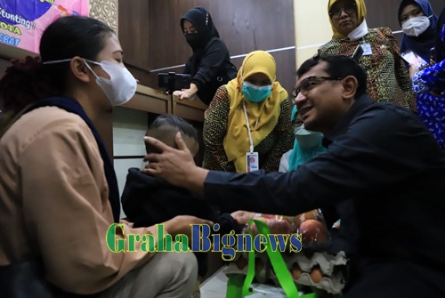 Wakil Bupati Garut, dr. Helmi Budiman, menyerahkan PMT kepada balita yang mengalami stunting dan gizi buruk, di Kantor Kecamatan Garut Kota, Kabupaten Garut, Kamis (30/6/2022). (Foto : Muhamad Azi Zulhakim & Yogi Budiman/Diskominfo Garut-grahabignews.com).
