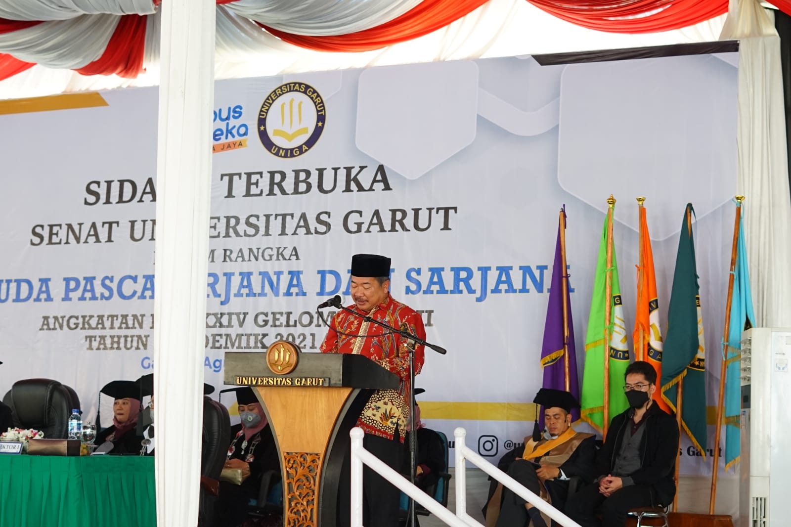 Bupati Garut, Rudy Gunawan Saat Memberikan Sambutan Pada Acara Wisuda Pasca Sarjana dan Sarjana Angkatan XXXIV Gelombang III Tahun Akademik 2021-2022 di Halaman Universitas Garut, Sabtu (06/08). (Foto: Tim Diskominfo Garut – grahabignews.com)