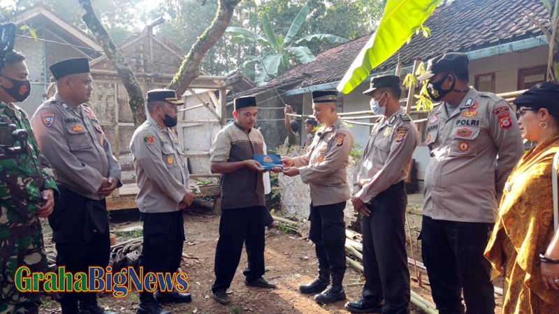 Penyerahan bantuan, diwakili oleh Aipda Umar Taufiq, S.Sos.I di dampingi Kapolsek Limbangan AKBP Uus Susilo, SE kepada Bapak Iya Rusyana.