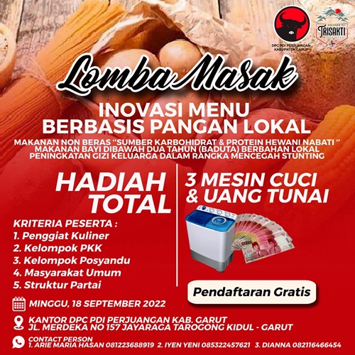 Kepada GrahaBigNews, Ketua DPC PDI Perjuangan Kabupaten Garut, Yudha Puja Turnawan menjelaskan, bahwa dengan digelarnya lomba masak dengan bahan pokok non beras ini guna menumbuhkembangkan kreatifitas masyarakat untuk mengembangkan dan menciptakan kuliner berbasis kearifan lokal yang menggunakan bahan pangan non beras.