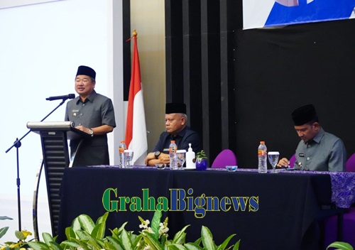 Bupati Garut, Rudy Gunawan, memberikan sambutan dalam acara Rapat Koordinasi Pengawasan Daerah Tahun 2022 yang dilaksanakan di Ballroom Hotel Harmoni, Jalan Cipanas Baru, Kecamatan Tarogong Kaler, Kabupaten Garut, Kamis (29/12/2022). (Foto : Ilham Kautsar P & Deni Seftiana/Diskominfo Garut-grahabignews.com).