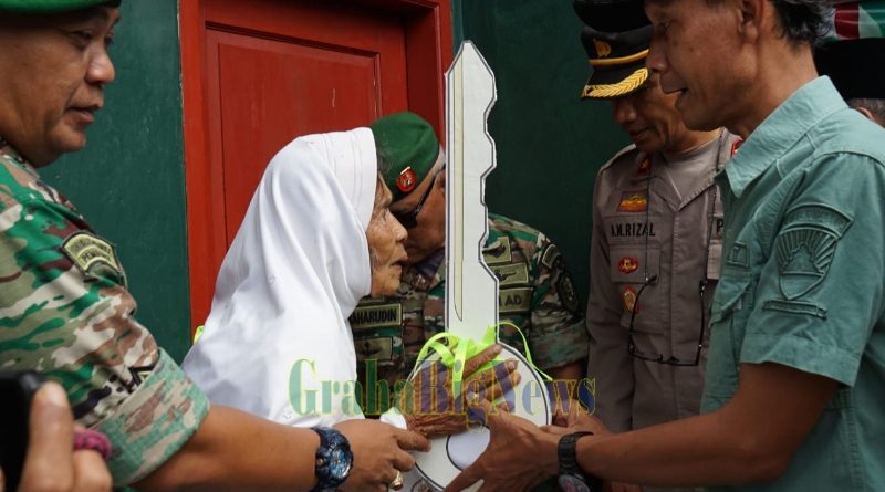 grahabignews.com, Sumedang- Danramil 1001/Sumedang Utara, Kapten Inf Dede Baharudin meresmikan pembangunan rumah tidak layak huni (rutilahu) milik Mak Ajah (80), hasil bhakti sosial Kodim 0610/Sumedang di Desa Mekarjaya, Kecamatan Sumedang Utara, Jum’at (17/02).