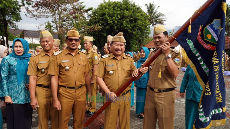 Bupati Garut, Rudy Gunawan menyerahkan penghargaan Sinergitas Kinerja Kecamatan Tahun 2023 atau Pataka Purwa Intan Kedaton dalam apel gabungan terbatas di Lapangan Sekretariat Daerah (Setda), Senin (27/03). (Foto: Diskominfo Garut – grahabignews.com)
