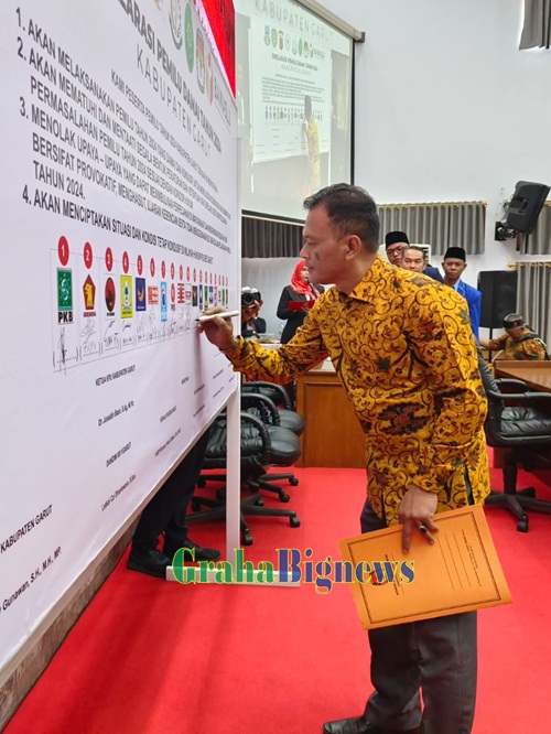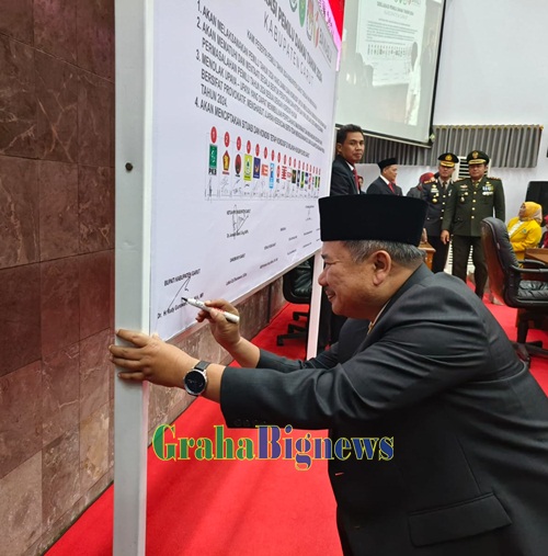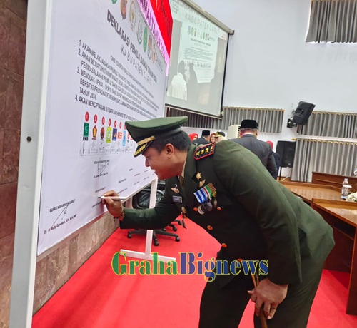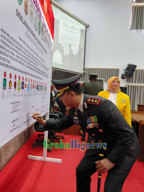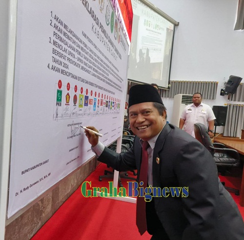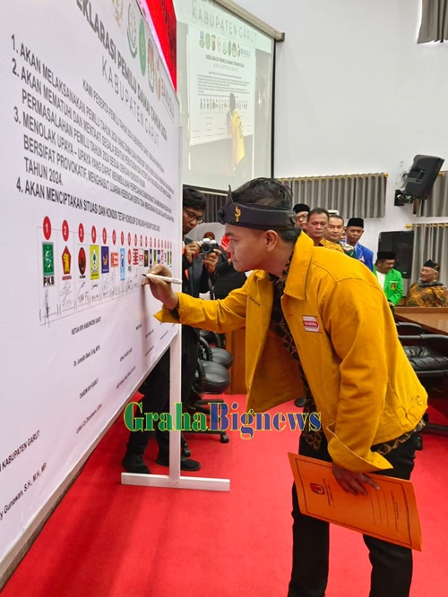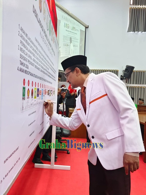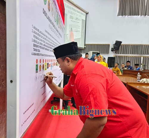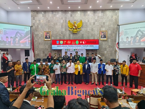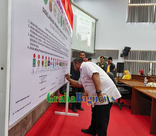 Grahabignews.com, Garut – Bupati Garut, Rudy Gunawan, mengambil peran penting dalam Deklarasi Damai Pelaksanaan Pemilu Tahun 2024 di Kabupaten Garut. Deklarasi ini berlangsung usai mendengarkan Pidato Kenegaraan Presiden Republik Indonesia, Joko Widodo, yang disiarkan melalui siaran televisi dalam dalam Rapat Paripurna DPRD Garut, di Ruang Rapat Paripurna DPRD, Jalan Patriot, Kecamatan Tarogong Kidul, Kabupaten Garut, pada Rabu (16/8/2023).