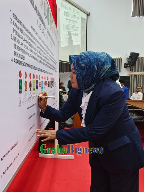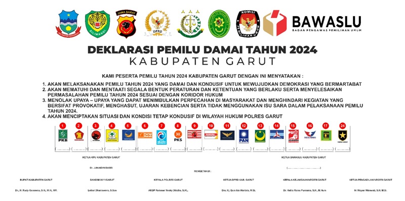 “Hari ini marilah kita bersama-sama sebagai warga Garut berkomitmen untuk mengadakan pemilu yang damai, demokratis,” ucapnya.