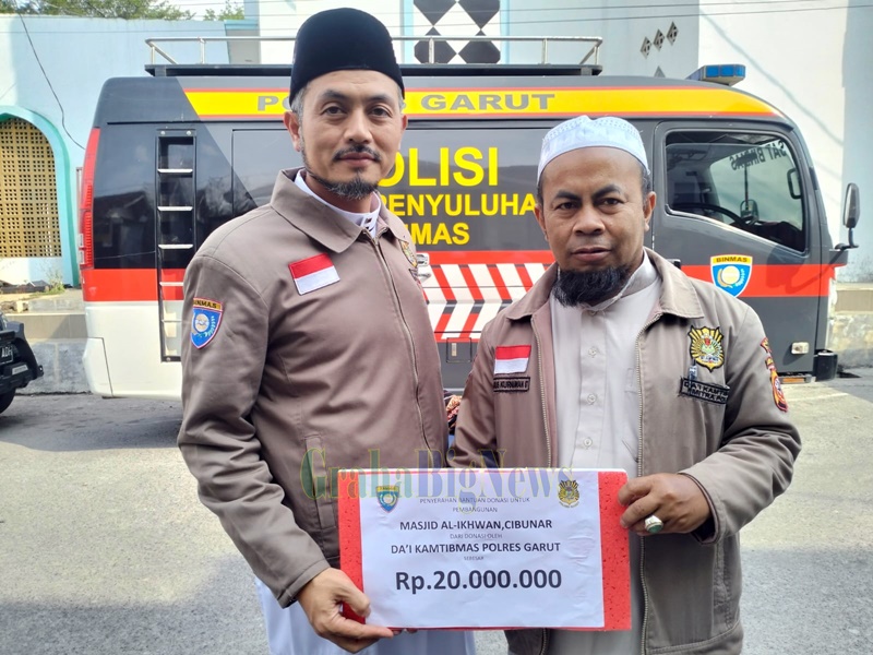 Grahabignews, Garut – Kanit Bintibmas SatBinmas Polres Garut Aiptu Umar Taufik, S. Sos. I Beserta Ketua Dai Kamtibmas Polres KH. Yayan Ahmad Muzaki, salurkan donasi finishing pembangunan masjid, Jum’at (17/11).
