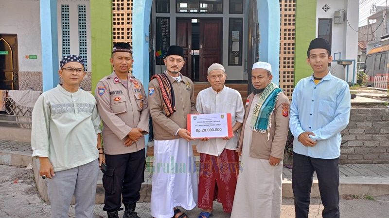 Grahabignews, Garut – Kanit Bintibmas SatBinmas Polres Garut Aiptu Umar Taufik, S. Sos. I Beserta Ketua Dai Kamtibmas Polres KH. Yayan Ahmad Muzaki, salurkan donasi finishing pembangunan masjid, Jum’at (17/11).