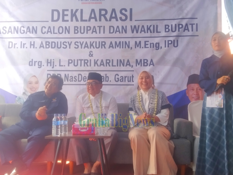 “Alhamdulillah pada hari ini drg. Hj. L. Putri Karlina, MAB. sudah memiliki pasangannya, Dr. Ir. H. Abdusy Syakur Amin, M.Eng., IPU. dan kami deklarasikan pasangan tersebut,” tutur Ketua DPD Nasdem Garut.