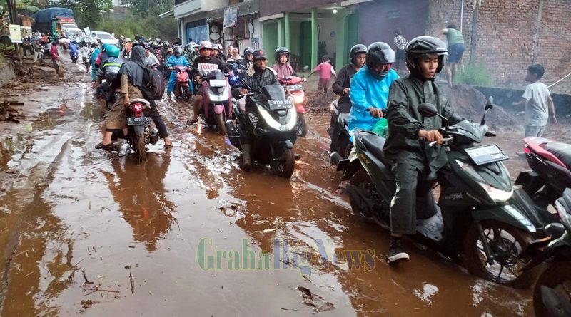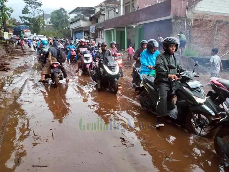 Banjir ini berdampak signifikan pada lalu lintas kendaraan roda empat maupun roda dua, yang kesulitan melintasi jalan yang tertutup material lumpur.