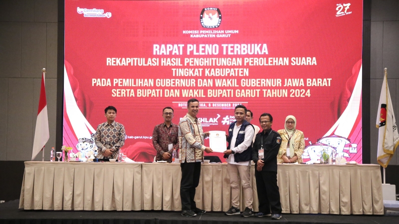 Grahabignews, Garut – Komisi Pemilihan Umum (KPU) Kabupaten Garut resmi menyelesaikan Rapat Pleno Terbuka Rekapitulasi Hasil Penghitungan Perolehan Suara Pemilihan Gubernur dan Wakil Gubernur Jawa Barat serta Pemilihan Bupati dan Wakil Bupati Garut Tahun 2024 di Hotel Santika, Jalan Cipanas Baru, Kecamatan Tarogong Kaler, Kamis (05/120).