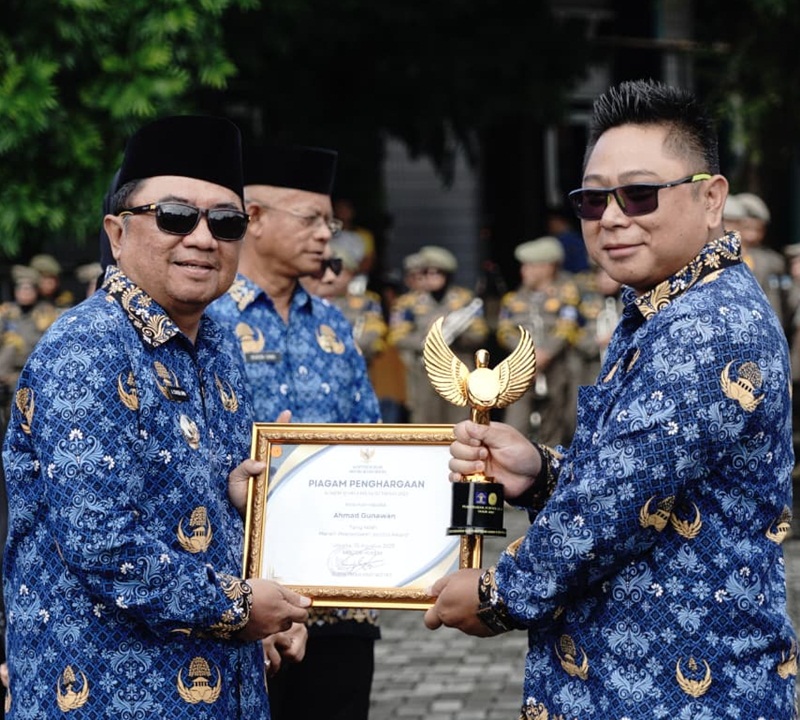 Penyerahan penghargaan berlangsung khidmat pada Upacara Peringatan HUT KORPRI ke-54 Tahun 2025 Tingkat Kabupaten Garut di Lapangan Sekretariat Daerah, Jalan Pembangunan, Kecamatan Tarogong Kidul, Kabupaten Garut, pada Senin (1/12/2025).