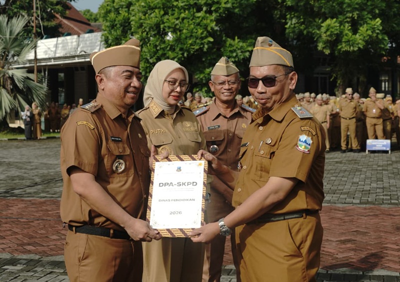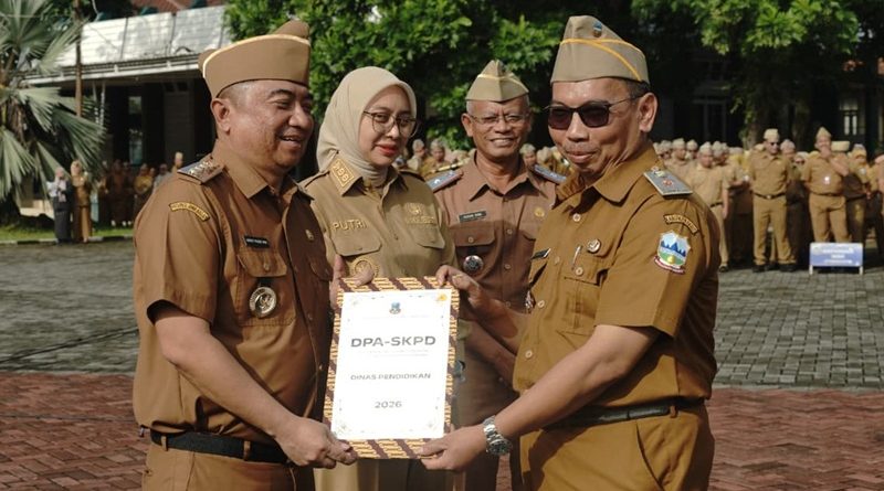 Grahabignewscom.Garut – Bupati Garut, Abdusy Syakur Amin, memimpin Apel Gabungan yang dirangkaikan dengan Penyerahan Surat Keputusan Bupati Garut tentang Pemberhentian PNS yang memasuki Batas Usia Pensiun Bulan Januari 2026, penyerahan penghargaan, serta penyerahan simbolis Dokumen Pelaksanaan Anggaran (DPA) Tahun 2026. Kegiatan tersebut berlangsung di Lapangan Sekretariat Daerah (Setda) Kabupaten Garut, Senin pagi (5/1/2025).